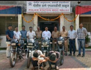 याबाबत मिळालेली माहिती अशी की, पोलीस उपनिरीक्षक प्रवीण पाथरकर यांनी गोपनीय माहितीच्या आधारे ओअॅसीस चौकात सापळा रचून आरोपी विष्णू ज्ञानेश्वर सोनवणे (रा. गणेश हाउसिंग सोसायटी वडगाव कोल्हाटी) व शुभम शांताराम जाधव (रा. झेंडा चौक, कुंभारवाडा, वाळूज) यांना अटक करण्यात आली. चौकशीत त्यांनी चोरीची कबुली देऊन चार दुचाकी पोलिसांना काढून दिल्या. या कारवाईत वाळूज पोलीस ठाण्यातील तीन गुन्ह्यांचा उलगडा झाला असून आरोपींना न्यायालयाच्या आदेशानुसार हर्सूल कारागृहात पाठविण्यात आले.