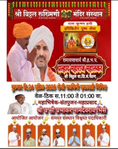 उद्या गुरुवार 24 रोजी सकाळी 11 ते 1 यावेळेत रामायणा चार्य ह.भ. प.प्रल्हाद महाराज महालकर, श्री विठ्ठल वारकरी शिक्षण संस्था पैठण यांचे हरी किर्तन आयोजित करण्यात आले आहे.