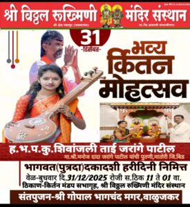 पंढरपुरात भव्य कीर्तन सोहळा Ramrao Bharad December 30, 2025 About Author Ramrao Bharad See author's posts Continue Reading Previous Previous post: पांडुरंग चोथे यांचा शिवसेना शिंदेगटात जाहीर प्रवेशNext Next post: घरातच कत्तलखाना, साडेसहा हजाराचा मुद्देमाल जप्त Leave a Reply Cancel replyYour email address will not be published. Required fields are marked *Comment * Name * Email * Website Save my name, email, and website in this browser for the next time I comment. संबंधित बातम्या वाळूजमहानरात सत्तांतर; भाजपा 3, उबाठा 2, राष्ट्रवादी (अप) 1, अपक्ष 1 February 11, 2026 व्हेरॉक टी-20 करंडक – ऑर्चिड इंग्लिश स्कूल उपविजेता पदाचे मानकरी; पुन्हा रोवला मानाचा तुरा January 13, 2026