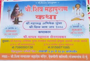 सोमवार 28 जुलै ते गुरुवार 7 ऑगस्ट पर्यंत दररोज सकाळी 9.30 ते 12.30 या वेळेत होणाऱ्या या संगीतमय श्री शिव पुराण कथा सोहळ्यात ह.भ. प. माधव महाराज सेनगावकर हे कथा वाचन करणार असून ह.भ. प. संतोष महाराज सुतार व त्यांचे सहकारी त्यांची संगीत साथ संगत करणार आहेत. यासोबतच श्री महारुद्र अभिषेक व श्री शिव नाम जप करण्यात येणार आहे .या कार्यक्रमाचा लाभ घेण्याचे आवाहन आयोजकांनी केले आहे.